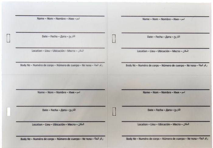 Our information tags are designed to provide clear identification and documentation for body bags. They can be attached directly to the bag or inserted into the document pouch.